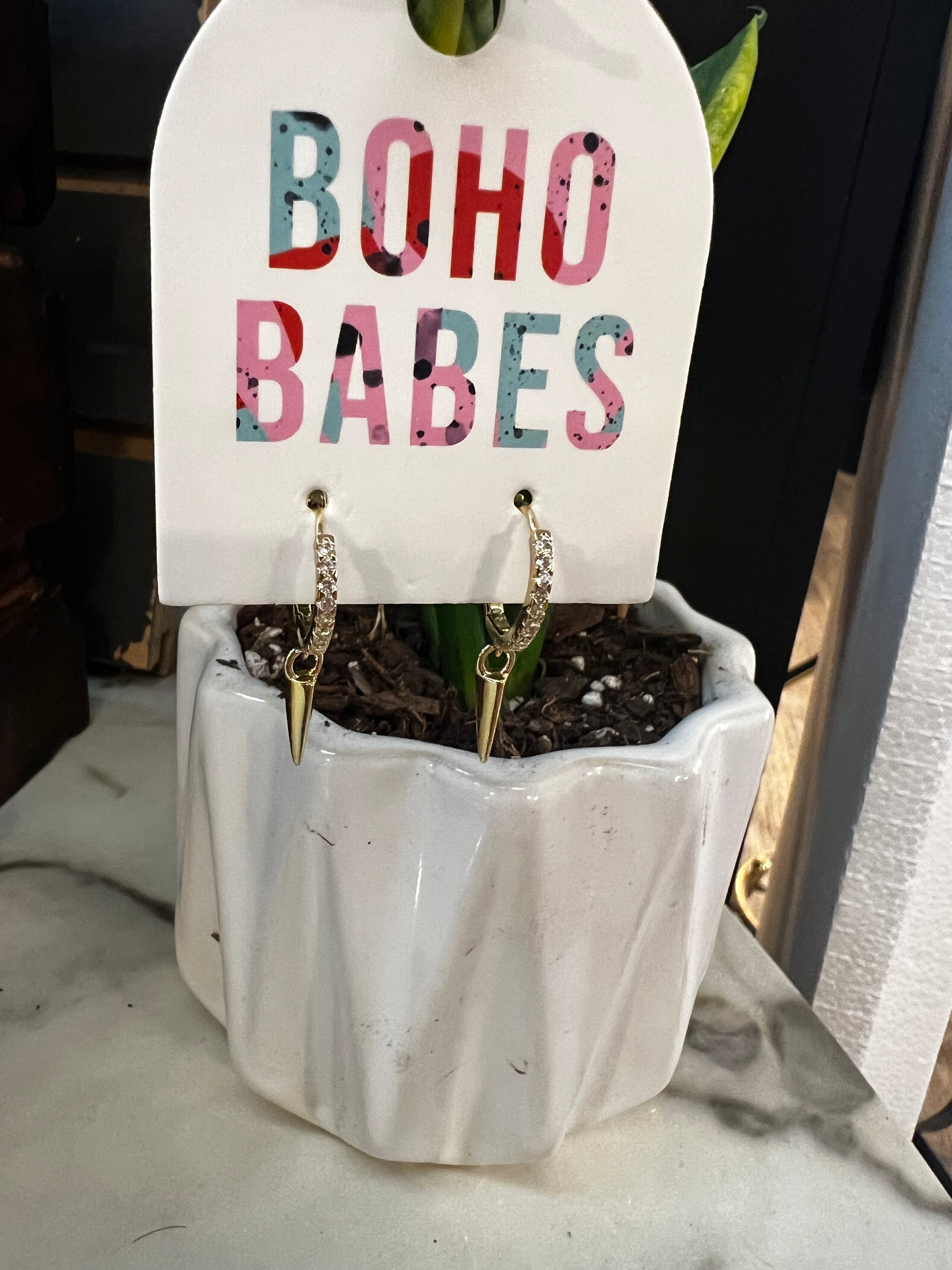 The Boho Babe Blink & Spike earrings boast a unique design with a mix of classic and contemporary styles. Featuring geometric shapes and a blend of gold and silver finishes, these earrings add a distinct touch to any wardrobe.