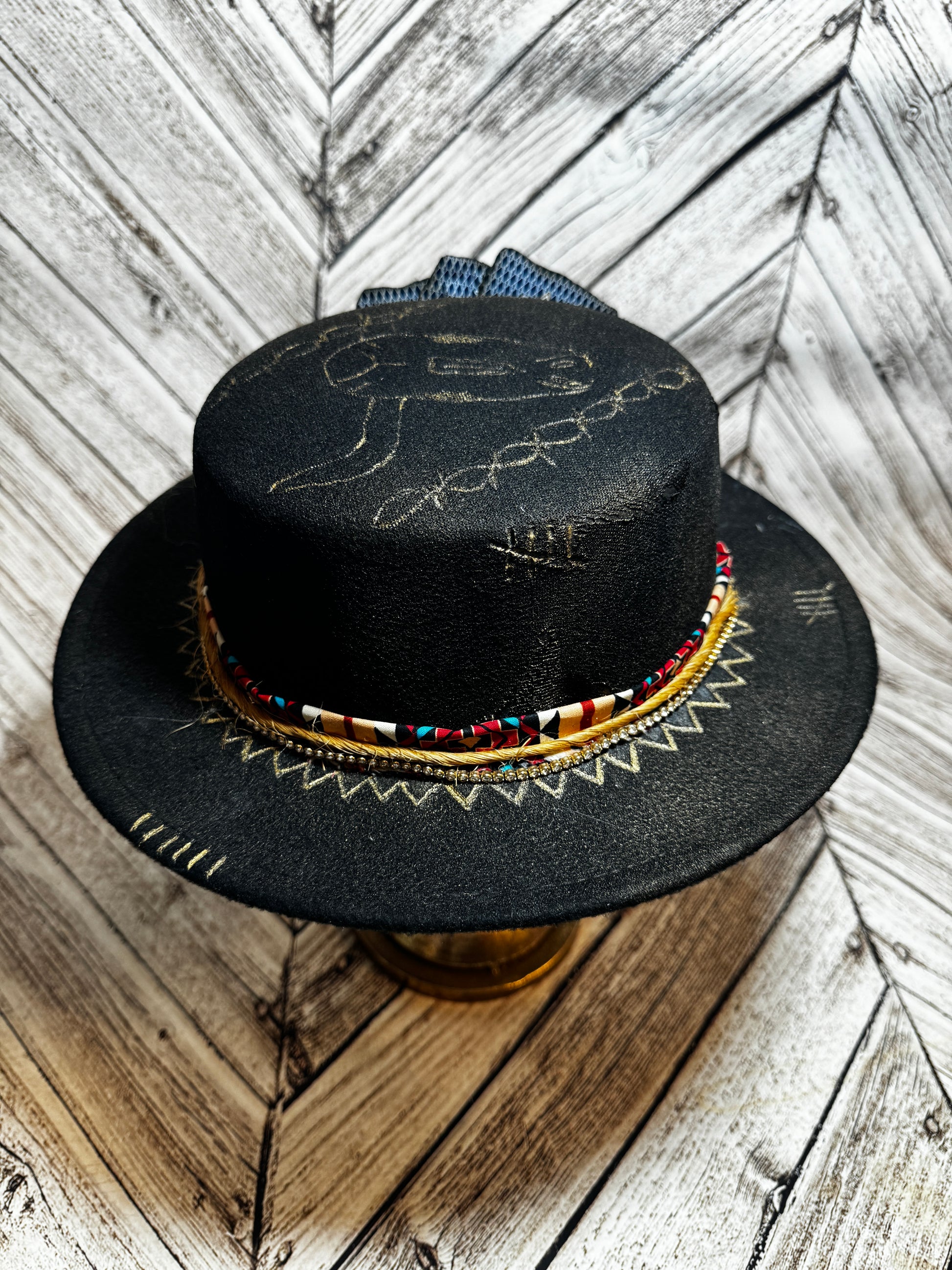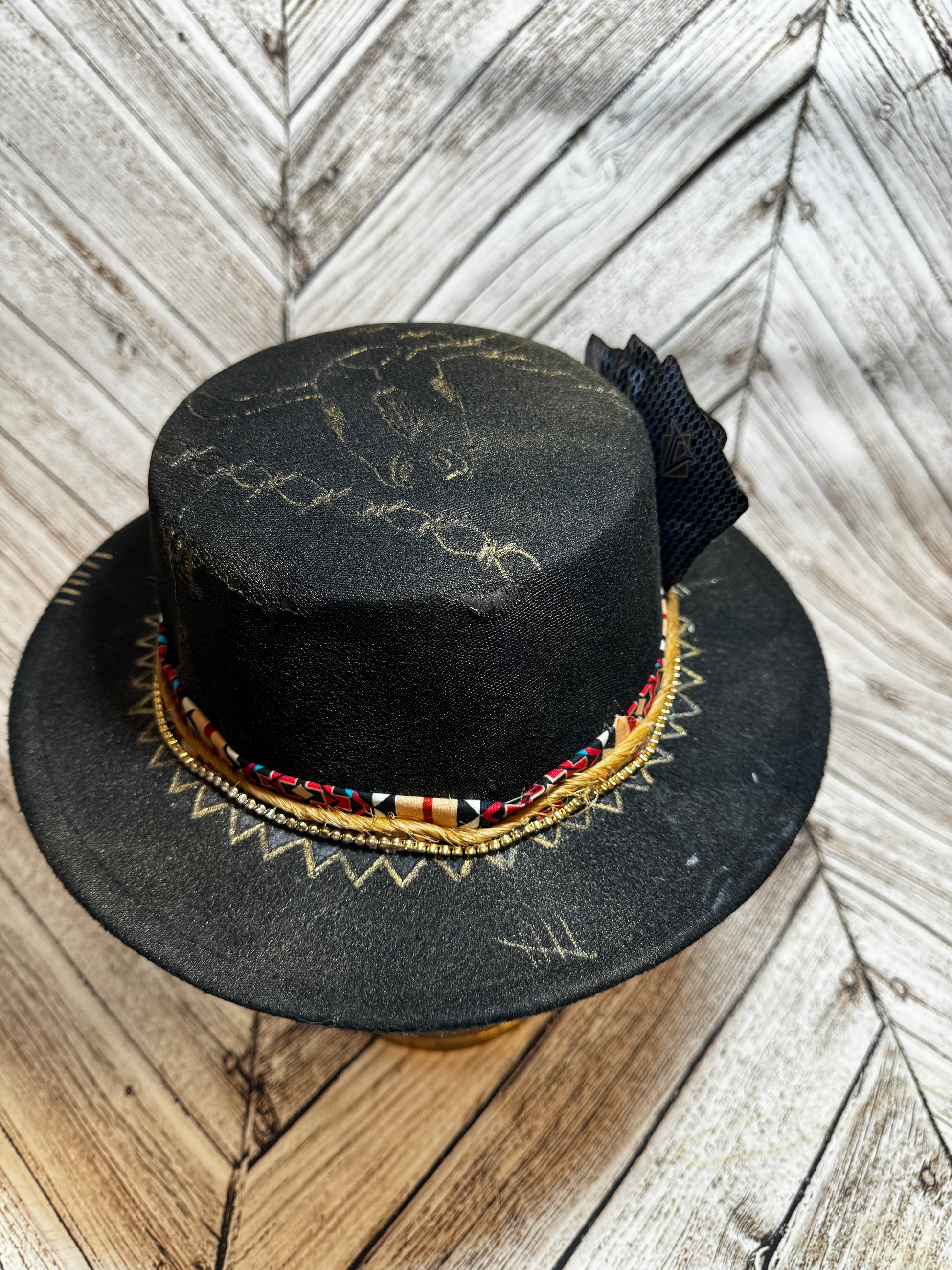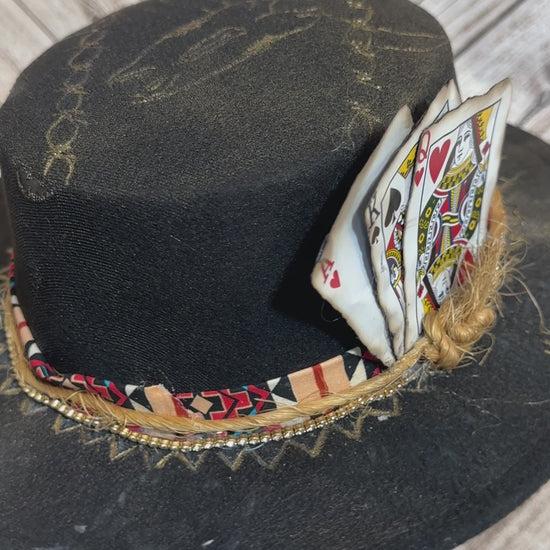 Custom felt hat with a good bull head burnt ace king and queen. Rhinestones Aztec and twine