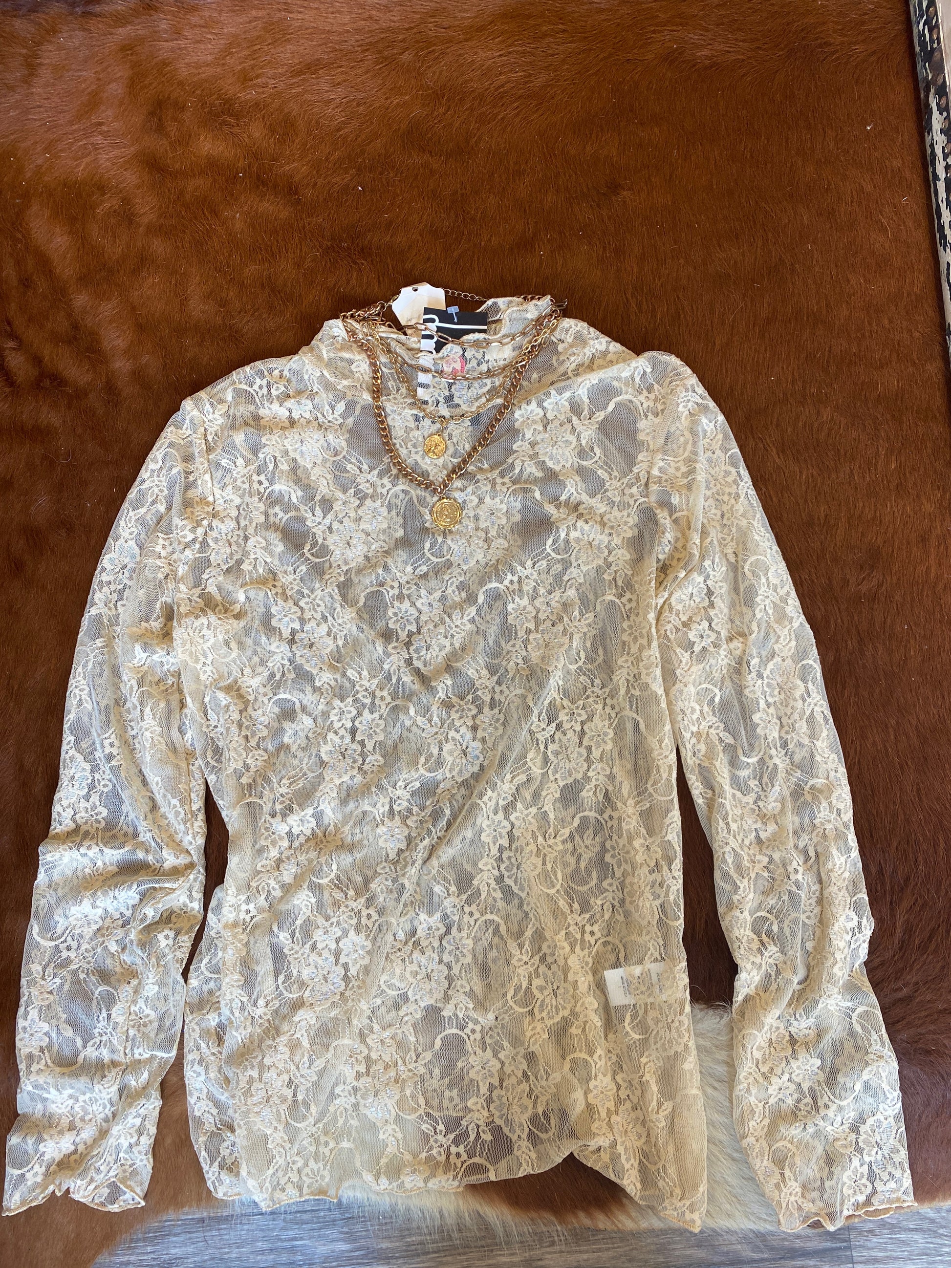"Liven up your wardrobe with Lainey In Lace! This long sleeve top features delicate lace detailing and a creamy color for a touch of elegance. Perfect for any occasion, add a little sophistication to your style with Lainey In Lace. (Note: Not just for tea parties!)"